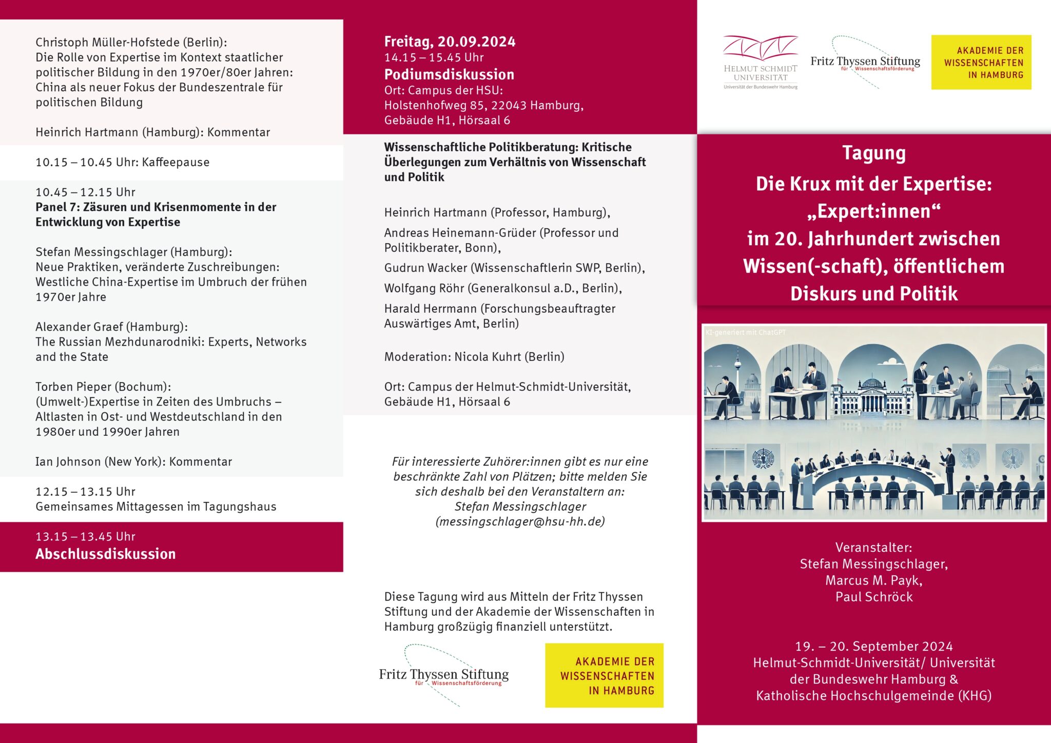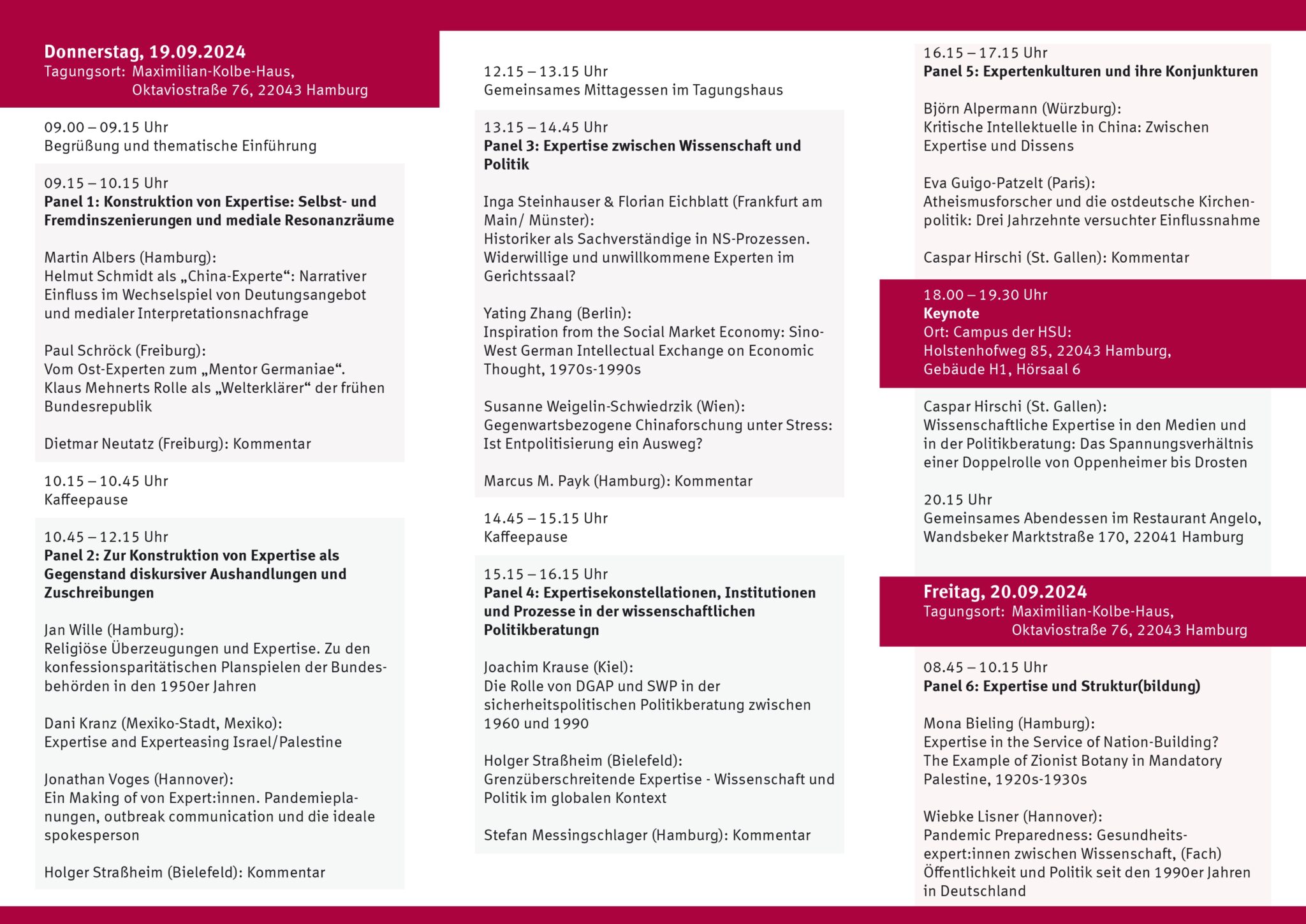 With our conference on September 19 and 20, 2024, in Hamburg, we aim to build on this: focusing on selected case studies from the early 20th century to the present, we want to reflect together on the phenomenon of expertise at the intersection of academia, public discourse, and politics. We do not see experts as essentialized figures, but rather seek a reflexive understanding of key categories and concepts. With this approach, we aim to open up the construct of expertise as a multifaceted and dynamic phenomenon – one that not only looks at the practices and interactions of experts but also investigates the negotiation and attribution of expertise, as well as the strategies experts use to profile themselves and build networks. How and between whom is it negotiated who is an „expert“? How can „expertise“ be distinguished from knowledge or competence? Is expertise synonymous with „expert knowledge“? What is the relationship between knowledge, academia and expertise in specific time periods and different cultural contexts? In which areas do experts play an advisory role and act as practical intermediaries (e.g., politics, economics)? How does expertise in a specific field become a subject of attribution and negotiation processes? What role do institutional structures play as conditioning factors for expertise, and how can the agency of experts be understood? We are addressing exactly these questions in our conference, funded by the Fritz Thyssen Foundation and the Academy of Sciences in Hamburg. Together with scholars from the fields of history, political science, sinology, sociology, and anthropology, we aim to reflect on the construct of expertise as a dynamic and multifaceted phenomenon.